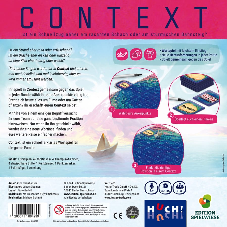 In Context diskutiert ihr gemeinsam über Begriffe und deren Eigenschaften und spielt dabei kooperativ gegen das Spiel. Mit kreativen Hinweisen versucht ihr, euer Team auf die richtige Position zwischen zwei frei gewählten Gegensatzpaaren zu lenken, etwa „haarig“ oder „weich“. Jede Runde bestimmt ihr selbst, worum es geht – von Filmen bis Gartenpflanzen. Das kommunikative Wortspiel ist schnell erklärt, für 3–8 Personen ab 8 Jahren geeignet und lädt zu amüsanten Diskussionen ein. Wer geschickt kombiniert, findet gemeinsam neue Wortinseln und gewinnt gegen das Spiel!