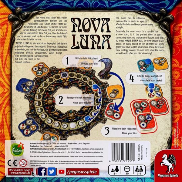 Der Mond übt schon seit vielen Jahrtausenden Einfluss auf die Menscheit aus. So steht der Neumond etwa für einen Neuanfang oder die Zeit, um über die Zukunft naczudenken und erste Schritte zu tun In Nova Luna müssen die Spielenden mit der immer wieder neuen Auslage der Monduhr umgehen, um Aufgaben möglichst effektiv zu erfüllen. Jede Entscheidung bringt dabei weitreichende Konsequenzen für die Zukunft mit sich.