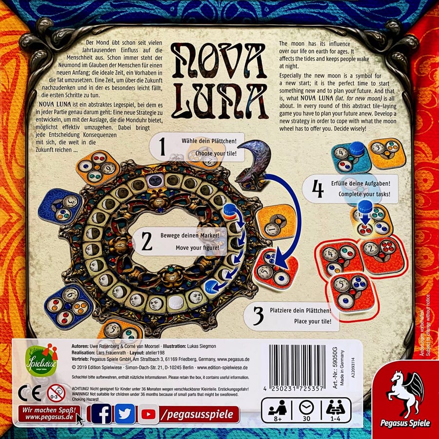 Nova Luna ist ein familienfreundliches Legespiel, das voller strategischer Entscheidungen steckt. Eine Soloregel macht das Spiel auch alleine spielbar.