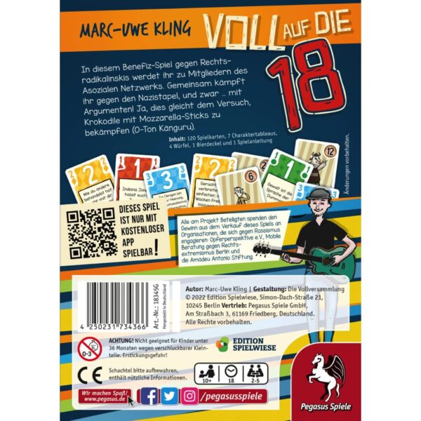 Voll auf die 18 ist ein kooperatives Kartenspiel von Marc-Uwe Kling für 2–5 Personen ab 10 Jahren. Als Team aus bekannten Charakteren der Känguru-Chroniken versucht ihr, Nazis mit den passenden Argumenten zu überzeugen. Dazu spielt ihr Zahlenkarten aus, deren Summe genau dem IQ der Nazikarten entspricht – jede Figur hat dabei eigene Regeln. Das Spiel wird von einer App begleitet, die für Zeitdruck und immer neue Herausforderungen sorgt. Mit viel Humor, Teamwork und Kopfrechnen kämpft ihr gemeinsam gegen Rechts – der Erlös des Spiels wird an Organisationen gegen Rassismus gespendet. Spieldauer: ca. 18 Minuten.